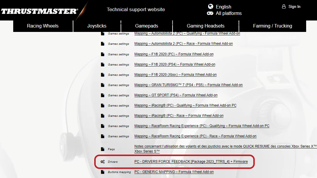 You can find the latest Thrustmaster drivers and firmware for your racing wheel on the Thrustmaster website, on their support page. From there you can search for your specific product and then scroll to the driver download file which is indicated by a gear icon next to the name.